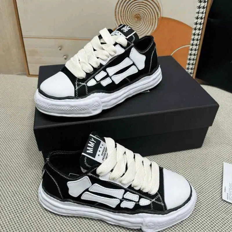 Com cabedal em couro preto premium e os tradicionais ossos em contraste aplicados à mão, o modelo se apoia sobre o solado vulcanizado assimétrico característico de Mihara Yasuhiro, conferindo um visual de desconstrução controlada que atrai olhares e dita tendência. É uma peça para quem busca exclusividade, moda autoral e presença.