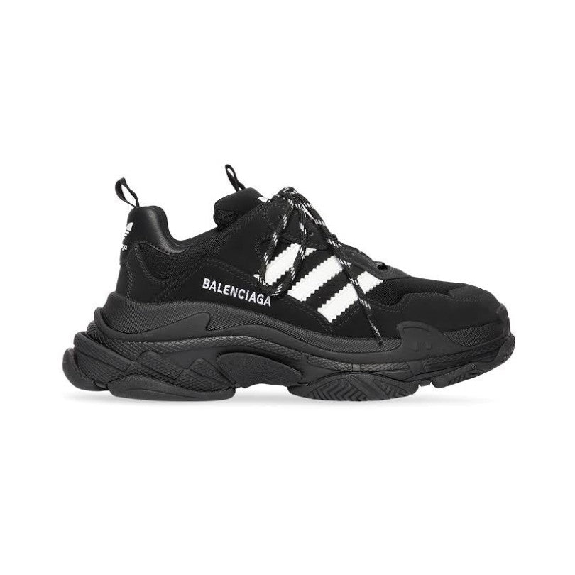Constructed with premium leather and mesh, this sneaker combines Balenciaga’s iconic chunky silhouette with Adidas’ legendary Three Stripes and trefoil logo. The sleek black base is contrasted with sharp white details, creating a modern, minimalist aesthetic with unmistakable impact.